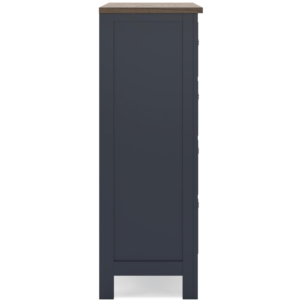 • Two-tone finish features a dark slate blue with a light brown wood-tone top