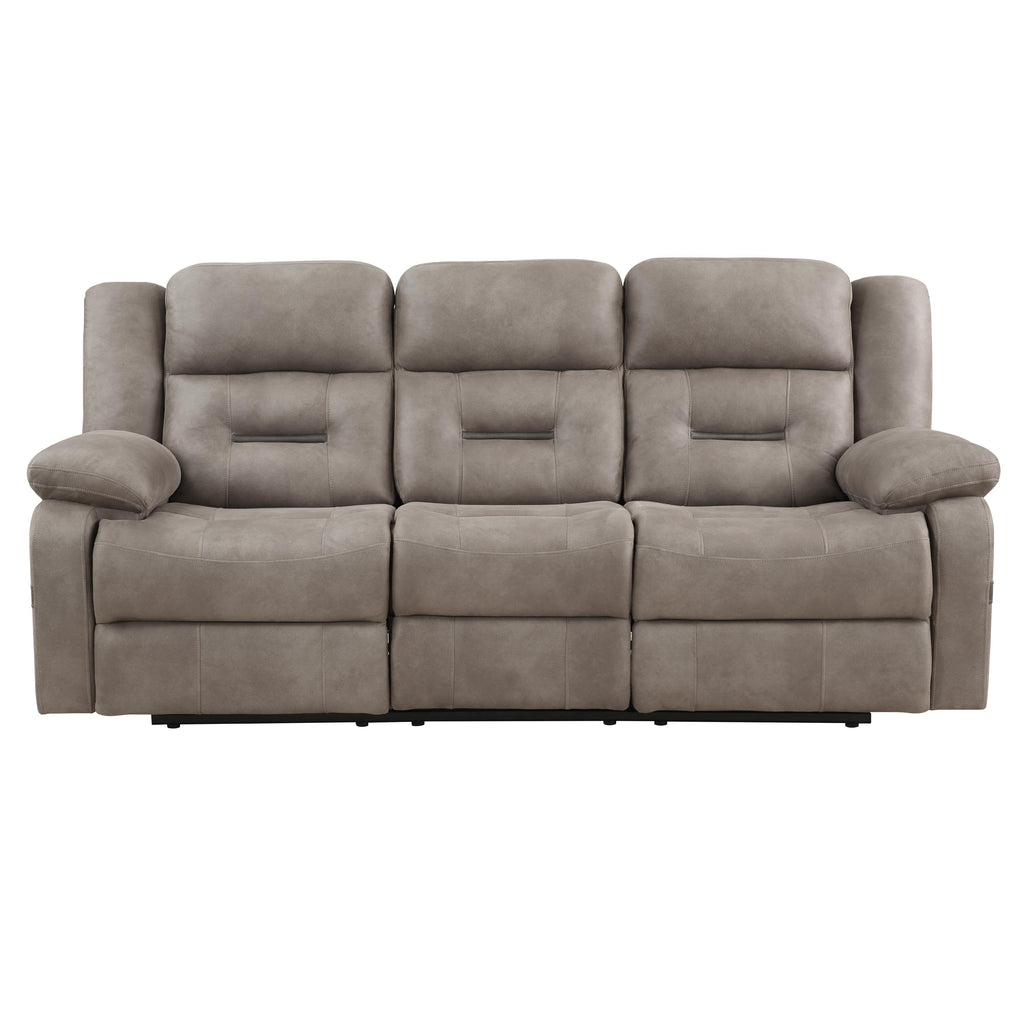 • The sofa features a drop-down console with a desk surface, two cupholders, plus a storage pouch for remotes, phones, and electronics